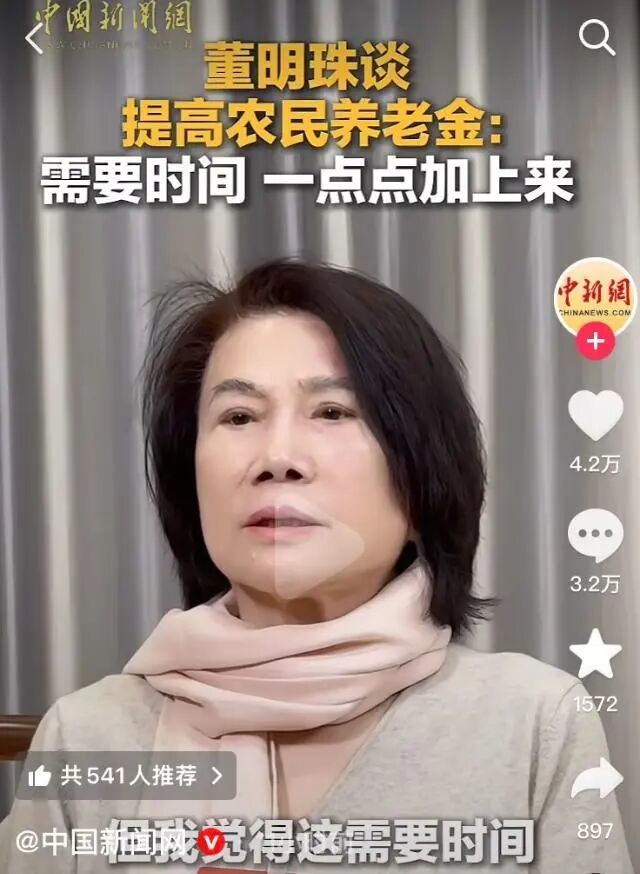 2026年,农民养老金再涨20元。针对这一话题,董明珠在接受采访时表示,给员工发奖金,一人1000块,企业就要掏出几个亿,给每人涨20元,财政压力同样巨大。